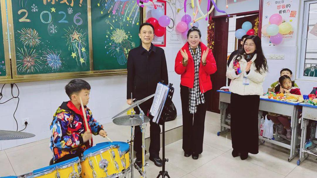 活动伊始,校长汤保刚通过校园广播,向全体师生发表了温暖而鼓舞的新年贺词。致辞中,汤校长回顾了过去一年学校在教育教学、课程改革、校园文化等方面取得的扎实进步,对师生的共同努力与社会各界的支持表示感谢。展望2026年,学校将继续坚守 “给孩子一个有记忆的童年” 的办学理念,以培养 “七好”少年 为目标,深化教学改革,加强师资建设,优化育人环境,并在课程创新、科技教育、体艺发展等方面持续探索,为每一位学生提供绽放光彩的舞台。汤校长寄语同学们保持好奇、担当与感恩,勇敢迎接新挑战;勉励全体教师继续用爱心与专业引领学生成长;感谢家长一直以来的信任,期待家校继续同心同行。最后,汤校长强调,教育是久久为功的事业,学校将始终秉持立德树人初心,努力创办人民满意的教育。