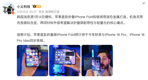 说到这里,可能有人会说这台“完全体”是iPhone Fold。确实,这台苹果首款折叠屏的确非常值得期待,最近各种爆料消息也满天飞,传言它的铰链将采用液态金属打造。机身采用改良版钛合金,两项材料升级有望解决折叠屏耐用性与轻量化的核心痛点。