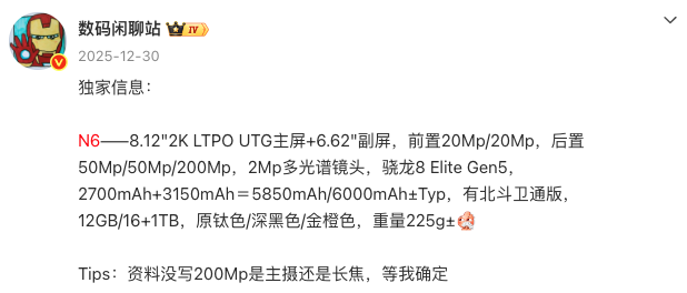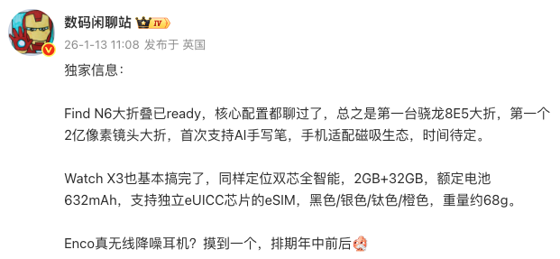 除此之外,OPPO Find N6 的爆料信息显示,它的综合配置将得到全面升级,或许会成为第一台骁龙8 Elite Gen5折叠+最大电池(6000mAh)的折叠+第一台2亿像素国产折叠,并首次支持AI手写笔、适配磁吸生态。