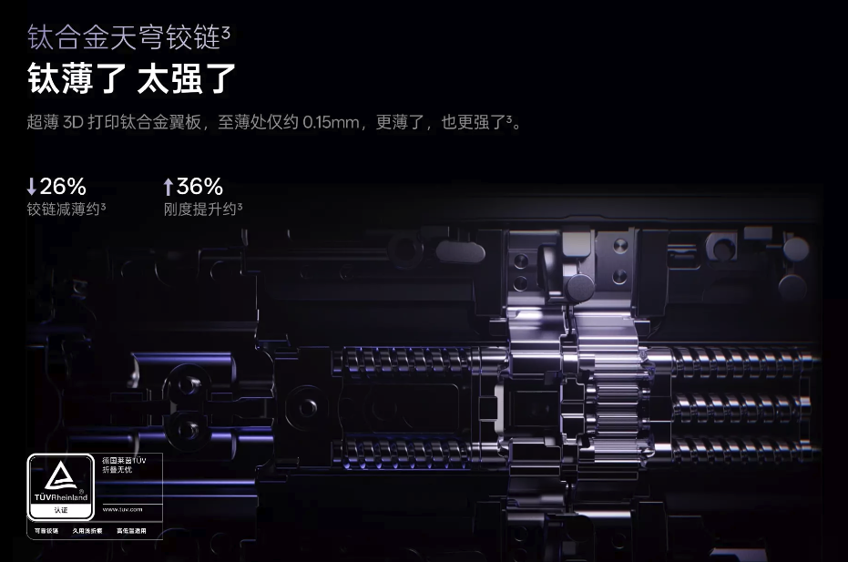 钛合金天穹铰链: 不仅降低了厚度(当时全球最薄的折叠旗舰),更让铰链的结构强度提升了一个台阶。