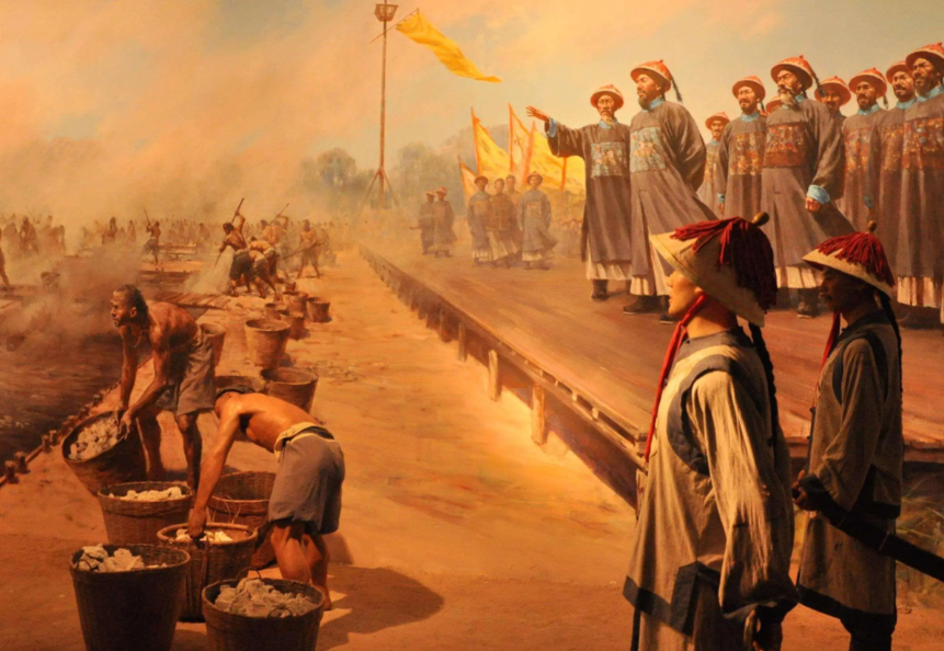 身后是浩浩荡荡两万箱缴获的鸦片,堆积如山,无数百姓站在远处,目睹着那一箱箱“福寿膏”化为灰烬。