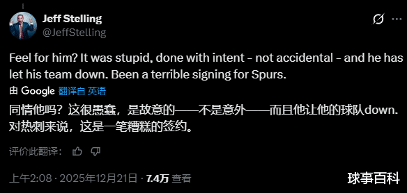 然而,前天空体育主持人、现任talkSPORT主持人的斯特林并不打算为这位22岁的球员说话。一位球迷表示为西蒙斯感到难过,斯特林在X上回应道:“为他感到难过?那动作很愚蠢,是故意的,绝非意外,他让球队失望了。对热刺来说,这是一笔糟糕的签约。”