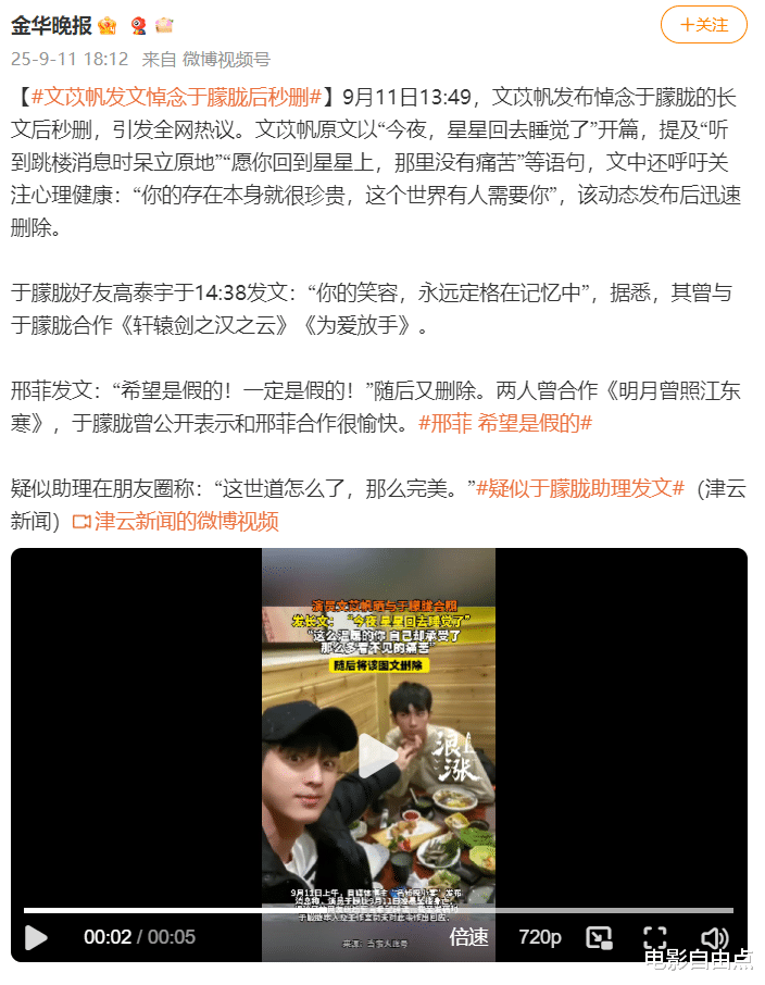 圈内好友文苡帆发文悼念:“晚安,亲爱的朋友,愿天堂没有痛苦。”虽很快删除,但截图已传遍网络。疑似助理也在朋友圈写道:“这世道怎么了,那么完美。”