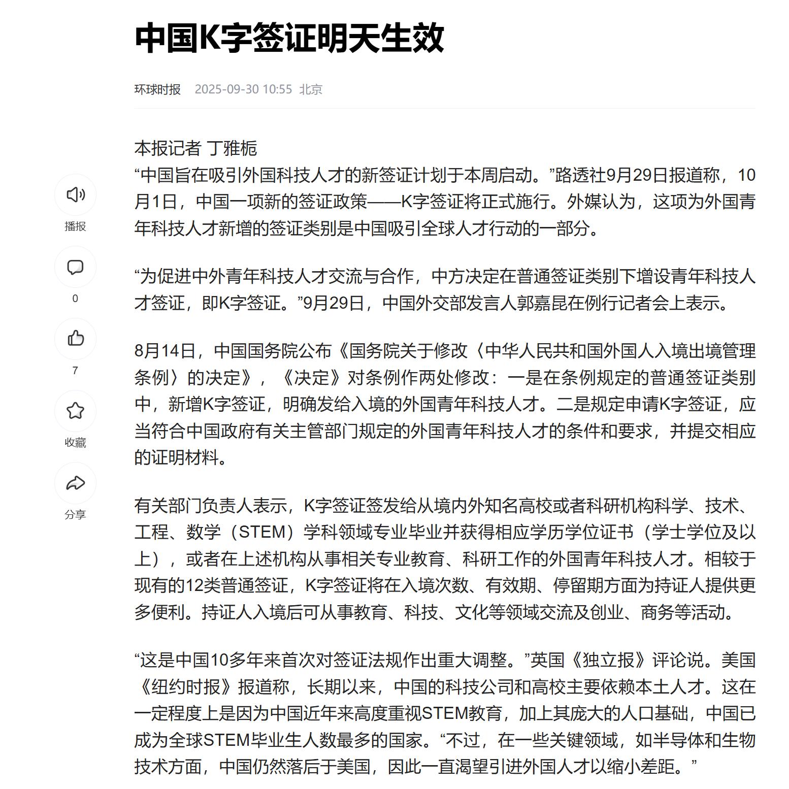 巧的是,中国在10月1日正式推出K字签证,专门给科技人才开绿灯,不用邀请函就能申请,还能多次往返。