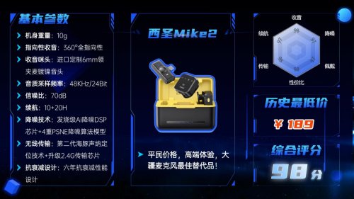 西圣Mike2麦克风过去主要深耕欧美市场,凭借卓越的音频技术和专业级性能,积累了超过十年的技术沉淀。近年转入国内市场后,凭借高音质、强降噪和便携设计迅速走红,成为创作者、主播和Vlog达人的首选。其百元级的定价却能提供千元级的音质体验,一经上线便销量爆火,甚至多次断货。