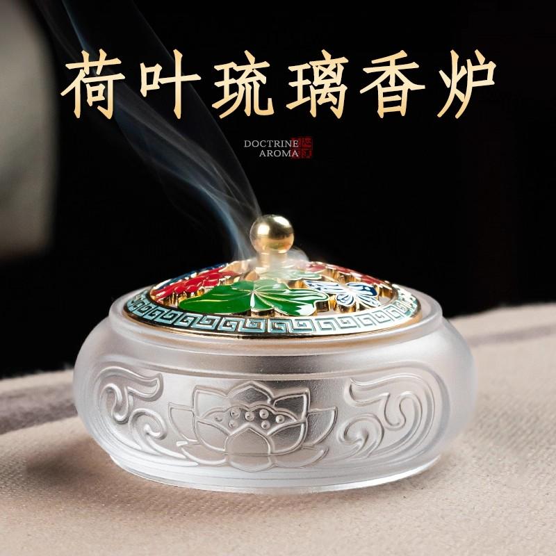 在一个闲适的午后,踏入一间古雅茶室。阳光透过雕花窗棂,洒在屋内,一切都被蒙上一层暖光。角落的案几上,一座古法琉璃荷叶香炉静静伫立,瞬间抓住了目光。