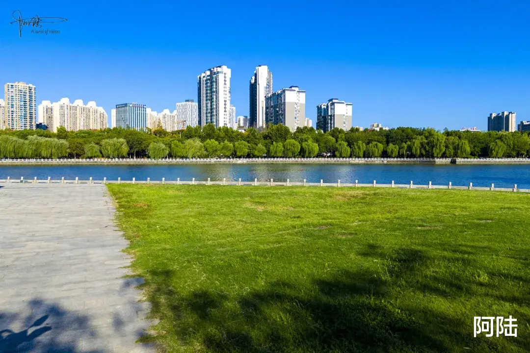 这片护城河其实就在大名鼎鼎的痛失“最大关公像”的关公义园旁边,风景和环境都打造得不错,骑行者甚至能深入到近水的广场,零距离接触大草坪和不远处的“道具古船”。唯一让人感到美中不足的就是,河水确实有点黄绿相间的混浊啊,也不知道是什么原因造成的。
