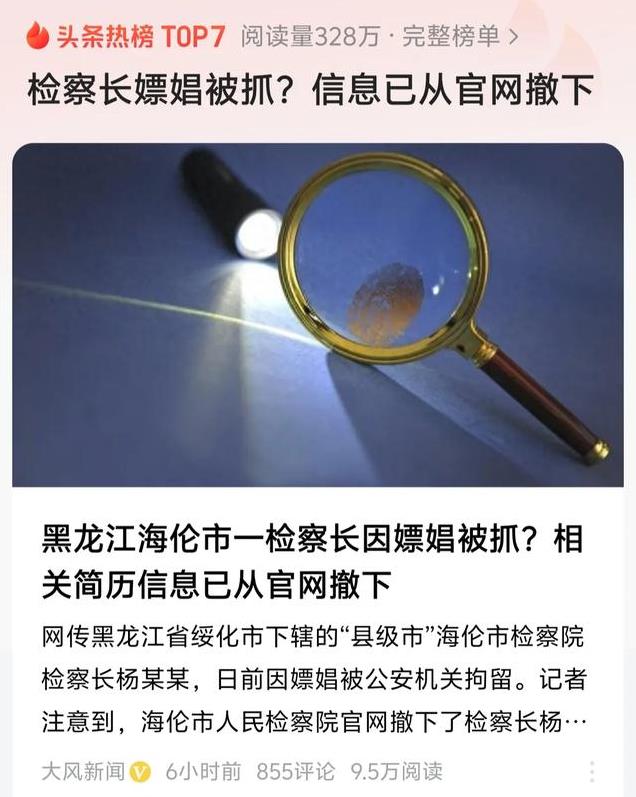 12月9日,人民的名义的检察长嫖娼的电视剧竟然在现实中存在。最新消息,黑龙江海伦市一检察长因嫖娼越闹越大,就是这样一位看似严肃的检察长,却因涉嫌嫖娼被公安机关拘留,可谓是电视剧的剧情现实版上演了。“法度Law”发布文章称黑龙江省海伦市人民检察院党组书记、检察长杨宏伟因涉嫌嫖娼被公安机关拘留。事件曝光后,当地检察院高度重视,该检察长已经被拘留,简历被撤下了。