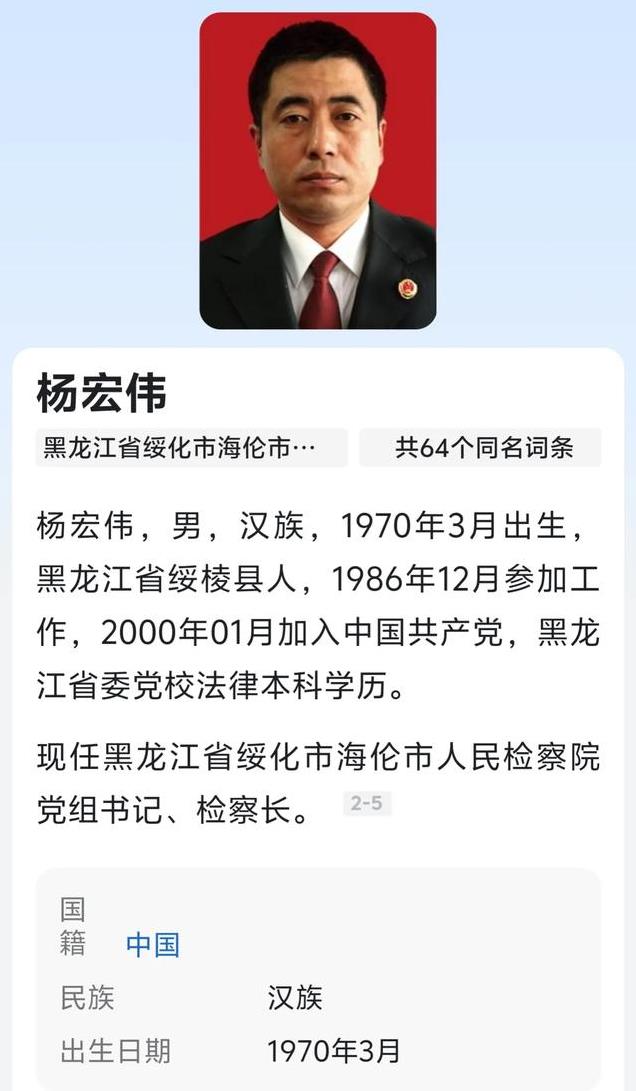 这位检察长的身份被扒。杨宏伟,汉1970年3月出生黑龙江省绥棱县,今年才54岁,还有6年就退休了,杨宏伟1986年12月参加工作,那时候才16岁,可谓是少年天才,不过其的学历是本科学历,一看就是函授的,其背后一定不简单。杨宏伟是黑龙江省委党校法律本科学历。现任黑龙江省绥化市海伦市人民检察院党组书记、检察长,其作为市检察院的一把手,县级市检察院检察长的级别是副处级?别。杨检察长可谓是非常优秀,获奖无数,为政法司法工作付出了很多的努力,在2021年11月,其入选2016-2020年黑龙江省普法工作先进个人公示名单。现在真是讽刺了,一个检察长竟然知法犯法,如此下流无耻,杨检察长嫖娼事件,无疑给法治权威带来了严重冲击。作为法律的执行者,检察长本应恪守法治原则,为民众树立榜样。然而,他却涉嫌违法行为,令人失望。