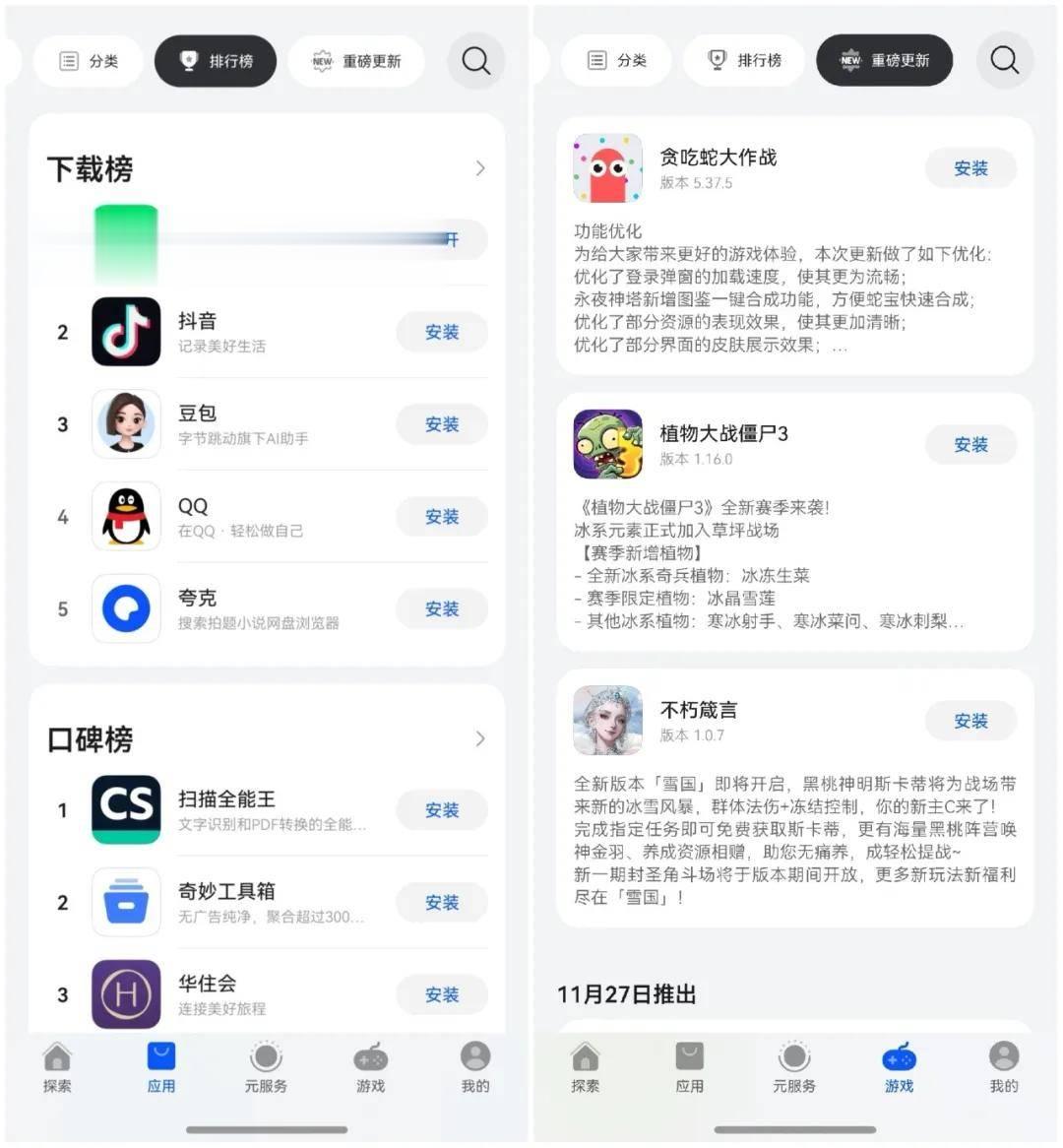 【重磅更新】则如同一位贴心的信息管家,大众使用的应用和游戏,每一次优质迭代都能专属曝光位,让用户知晓,而用户则省去了在海量应用中手动筛选、逐个点击查看的繁琐步骤,不错过每一次更新。