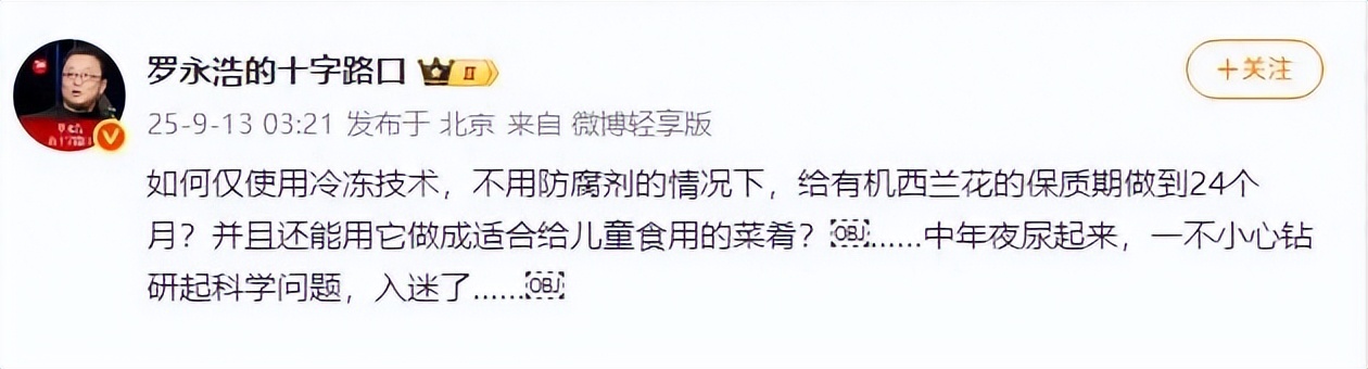 去年9月15日,罗永浩在微博发出了一记直球提问:不用防腐剂,光靠冷冻,怎么让有机西兰花保质两年?还能给孩子吃吗?