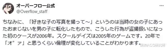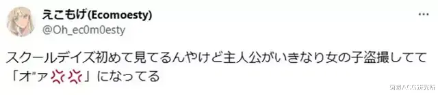 “顺带一提,这种『偷偷拍喜欢的人照片』的行为,在2005年前后,其实是当时女孩们之间流行的一种恋爱小迷信,后来才传到男生身上。直到2006年,这种行为才开始被明确定义为『偷拍』。而《School Days》游戏是2005年发售的,所以这在当年并不被视为犯罪行为。”