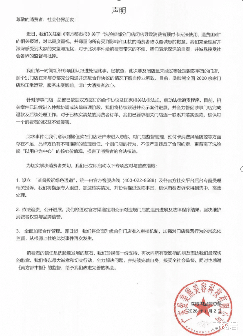面对舆论风暴,洗脸熊创始人唐华波公开致歉,承认“监管不到位”,并表示已对涉事门店启动法律追责程序。