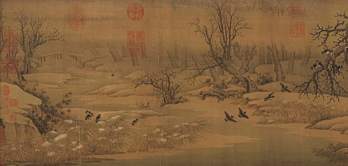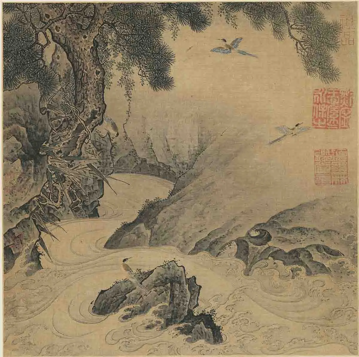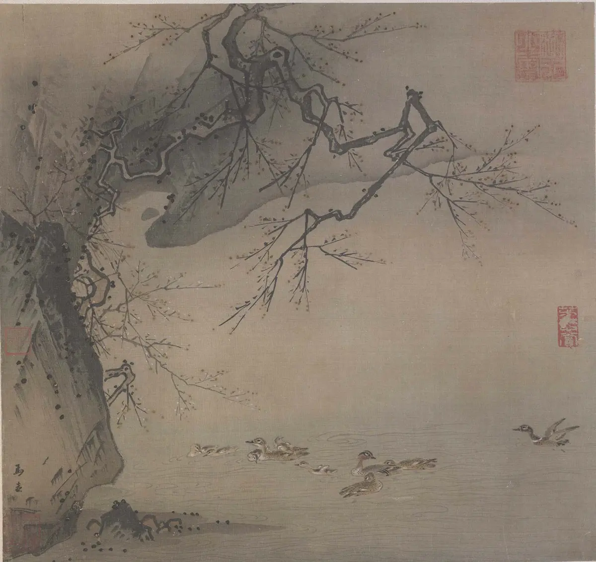 宋代是花鸟画与山水画各自成熟的时期,也是二者融合的起点。南宋院画家马远的《梅石溪凫图》即为早期典范:画面以山水为基底——溪口石崖与梅枝构成“一角”式构图,而水际群凫则成为视觉焦点,既体现了山水“可游可居”的空间感,又突出了花鸟的生动情趣。此类“小景式”构图通过环境烘托主体,打破了单一题材的局限。