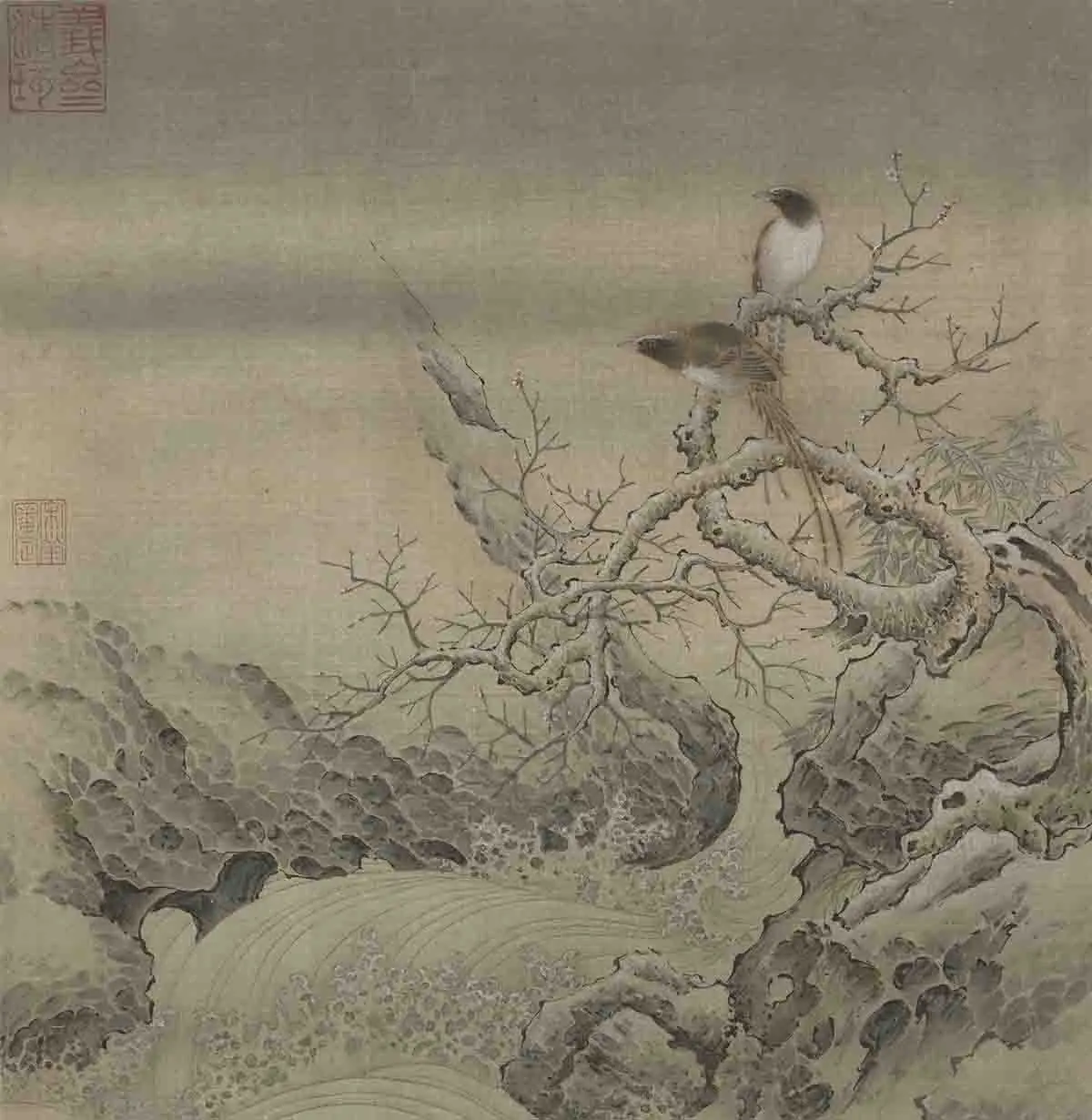 翎境画的艺术实践发端于宋元,拓展于明清,理论化于近现代。其核心在于通过山水与花鸟的跨科融合,实现从“个体刻画”到“整体意境”的升华。从马远《梅石溪凫图》的溪口小景,到恽寿平《山水花鸟图》的没骨通景,再到柳浪画派的双勾重彩与山水泼墨结合,这一脉络始终围绕“翎”与“境”的互动关系演进,成为中国画持续自我更新的典型例证。