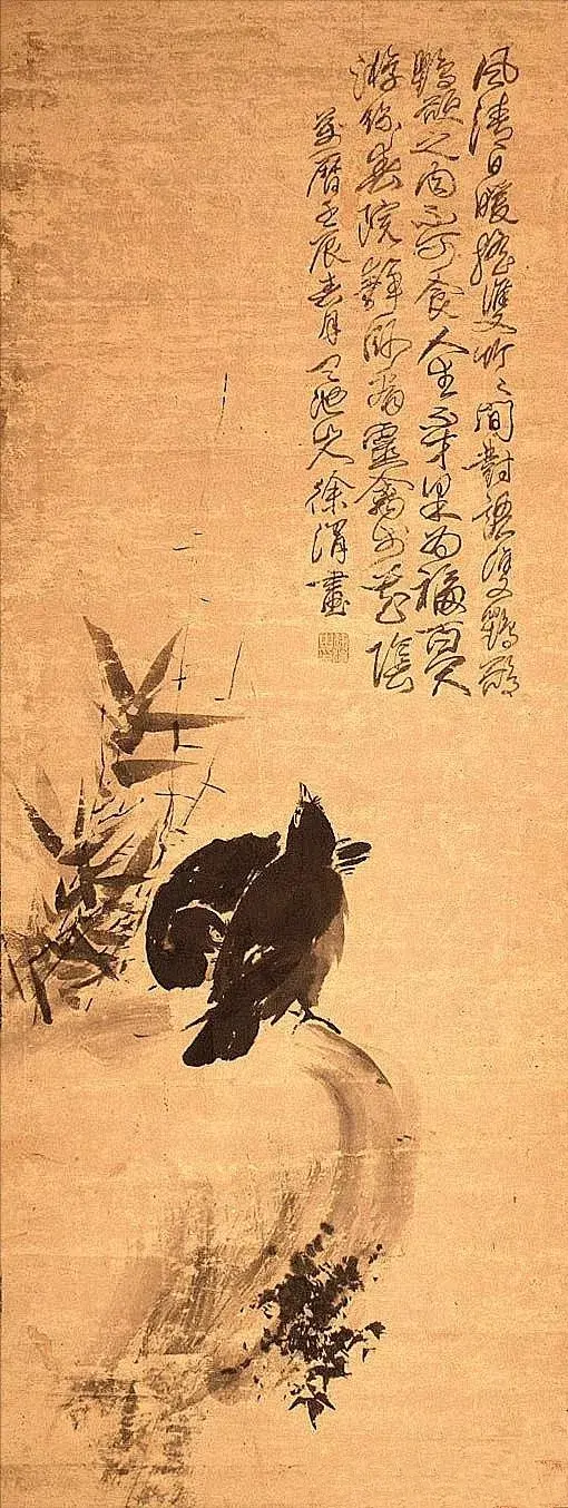 明代中后期,以沈周、陈淳为代表的文人画家将写意花鸟与简淡山水结合,突破工笔局限。尤其是徐渭的大写意花鸟,以狂草笔法贯通花鸟与树石,实现笔墨语言的统一。这种“以书入画”的写意体系,为翎境画中工写结合的技法调和提供了先例。