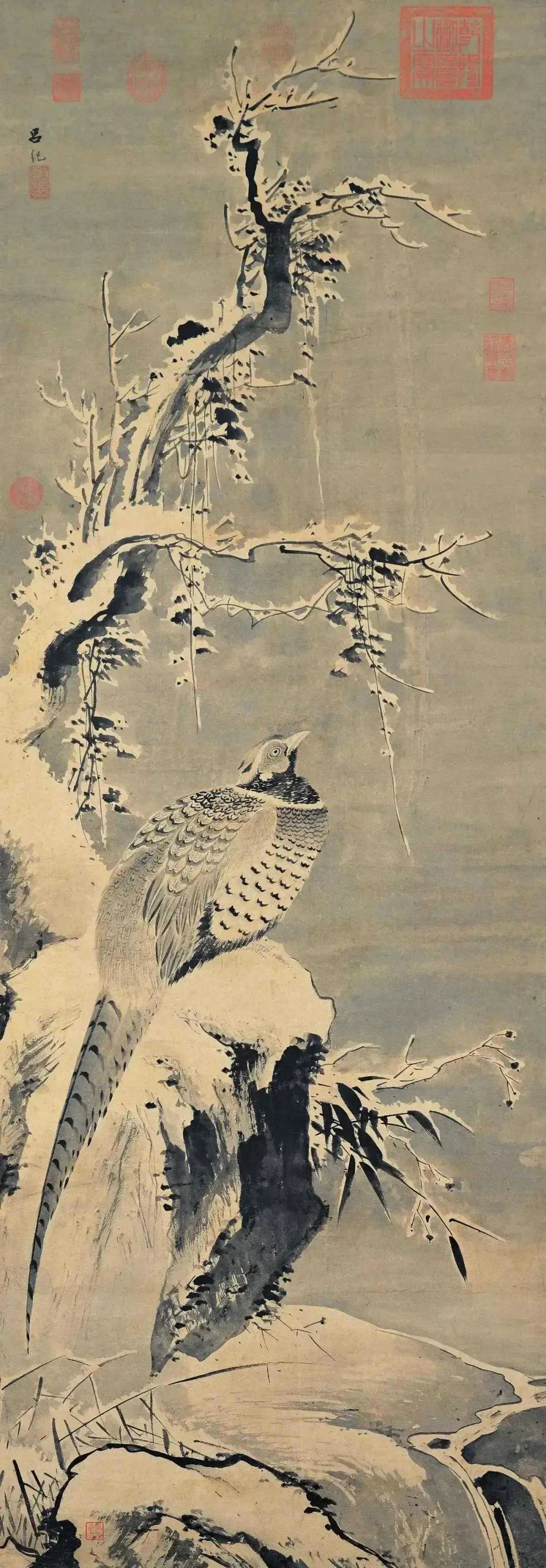 明代吕纪的《寒雪山鸡图》延续宋元传统,但进一步强化了山水的叙事功能:雪崖寒涧不再仅是背景,而是与山鸡形成“环境—生命”的戏剧性关联,通过自然险峻反衬生灵的顽强。此类作品已接近“翎境山水画”类型,即以山水为主体,花鸟作为点景元素提升画面生气。