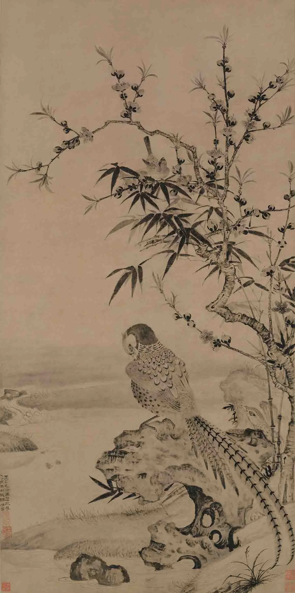 元代文人画兴起,推动花鸟画向水墨意趣转型。王渊的《桃竹锦鸡图》《山桃锦鸡图》以水墨皴染表现坡石竹木,将锦鸡置于近乎山水画的自然场景中,形成“以山水衬翎毛”的明确主次关系。此类作品在保留花鸟主体地位的同时,融入山水树的肌理与空间层次,可视为“翎境花鸟画”的雏形。