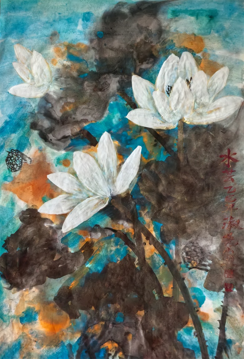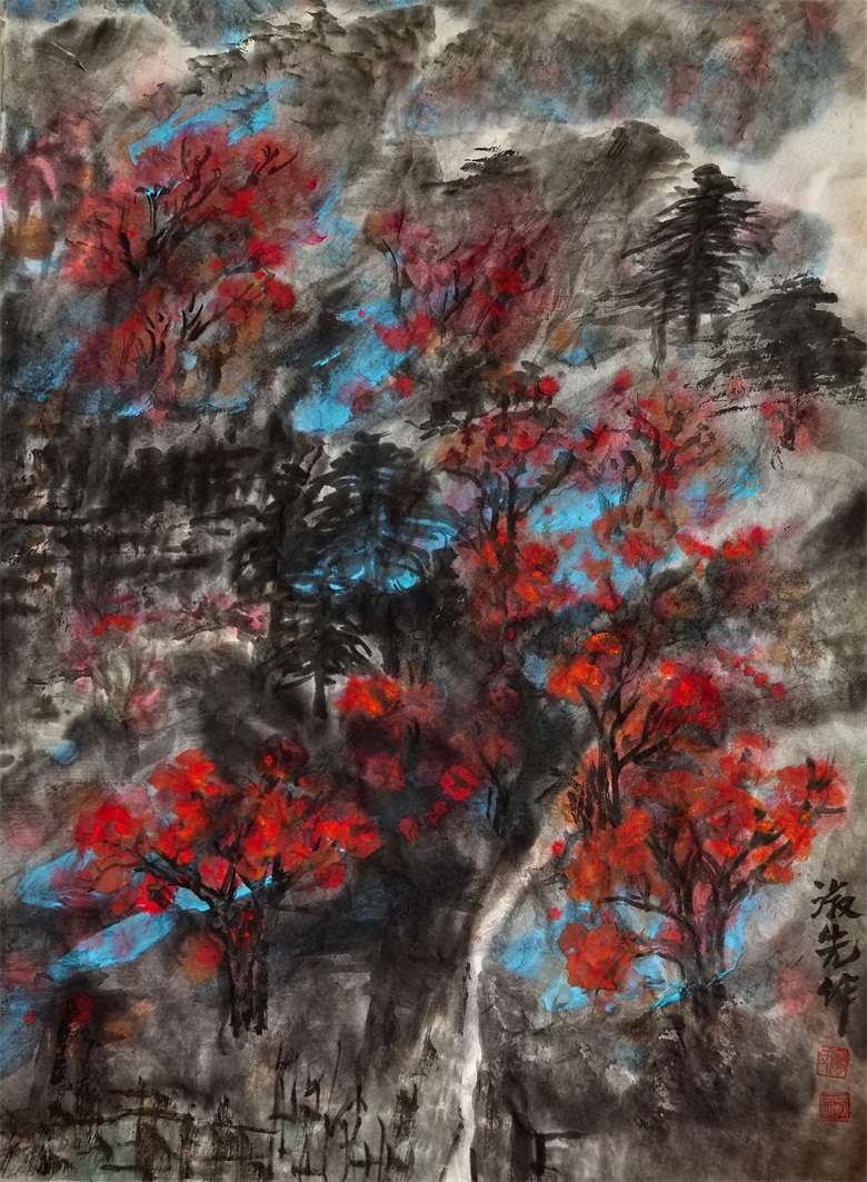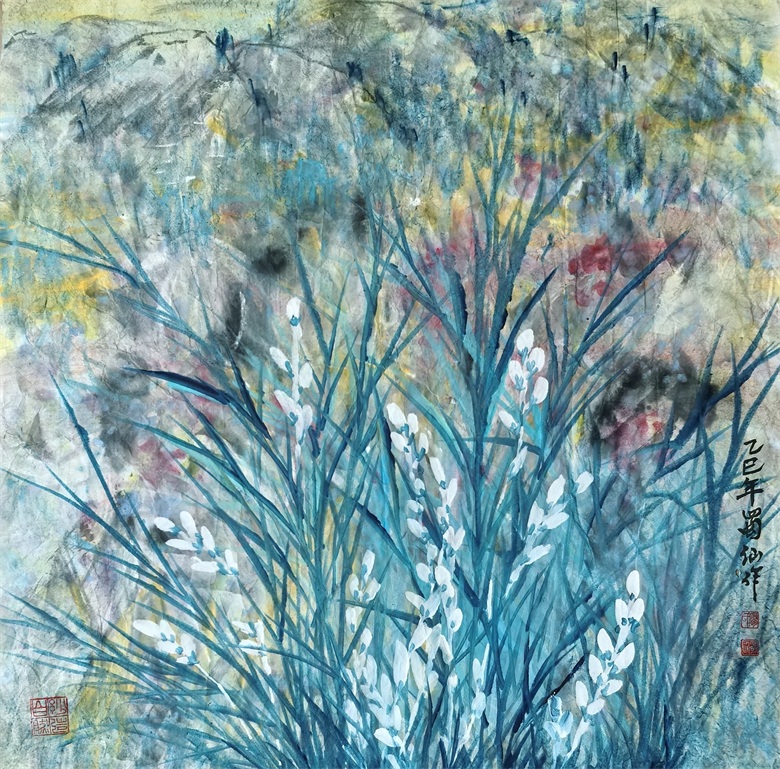 而从廖淑先的意象彩墨中,可以看到她对油画色彩的写意,以及对水彩、水粉的妙用。也许大多居住在国外使廖淑先对中西绘画有着独特的认知和理解,廖淑先的意象彩墨总是带着西方绘画的元素,也带着鲜明的中国画的气韵。她的意象彩墨,有激烈的、有温润的、有宁静的、有肃穆的、有清幽的、有浑厚的,色与色、色与墨、墨与水,层层交叠,乍合乍离,或虚或实,似若看到印象派的绘画风格,比如派莫奈的微妙,却多了一份概括,比如塞尚的肯定,却多了一份温润;也似若看到了巴洛克抽象表现主义风格,但不是无序的,而是严谨的,虽然也很自由,更多的则是色彩的秩序;还似若看到了张大千的色彩韵致,却隐现着女性的细腻、清雅、秀逸。显然,这是放眼中西绘画并结合自己特点所形成的写意考量,也是“润己情,达己意”的写意思辨,正因如此,廖淑先的意象彩墨显得高级,很有意思。