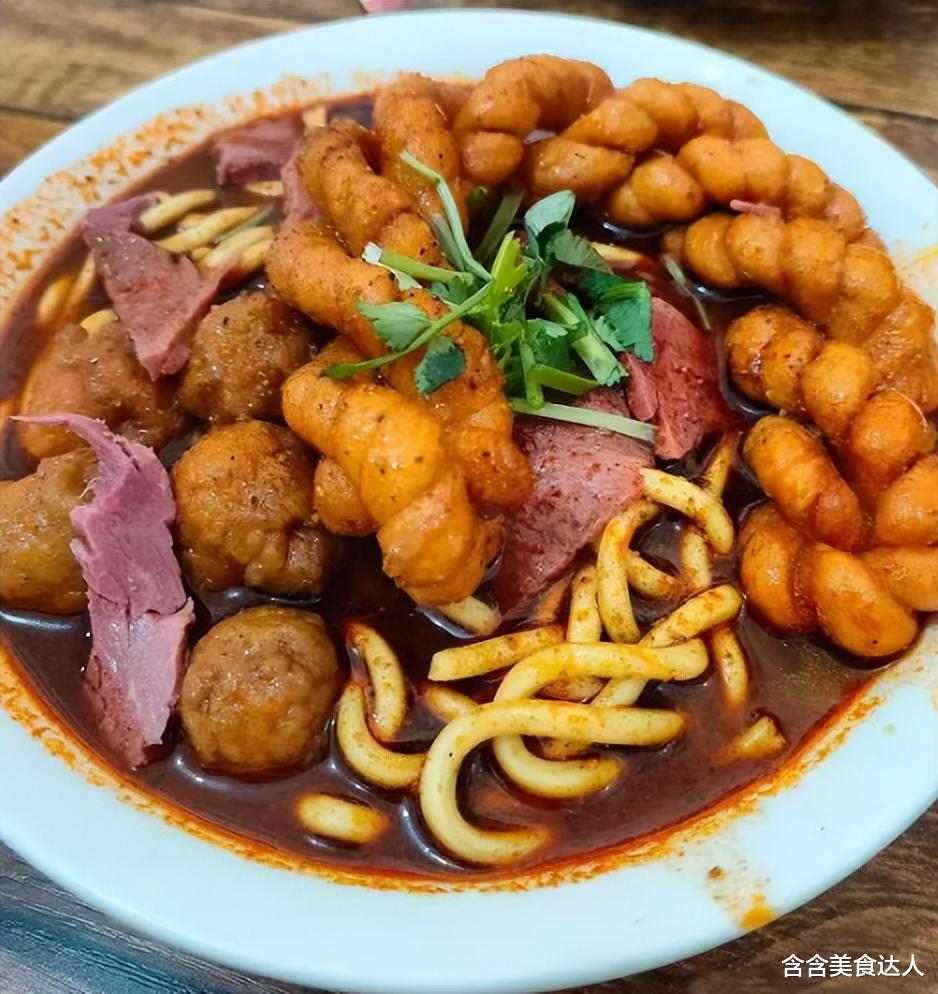 临汾牛肉丸子面作为山西特色美食,以香辣浓郁、面条劲道著称,汤底多用牛骨熬制,红油铺面,香气扑鼻。特色在于“牛肉”与“丸子”是分开的——大片卤牛肉搭配炸制的素丸子(非潮汕式牛肉丸),口感丰富,吸味十足。当地人常加麻花泡入汤中,酥脆与软韧结合,形成独特风味。