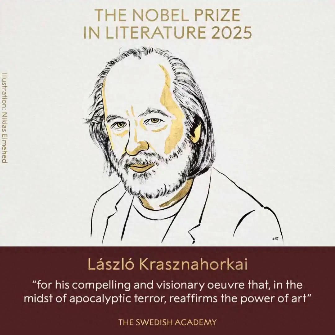 2025年诺贝尔文学奖授予匈牙利作家拉斯洛·卡撒兹纳霍凯(László Krasznahorkai),以表彰其“在末日恐怖的背景下,以引人入胜且富有远见的创作重申了艺术的力量”。获奖奖金为1100万瑞典克朗。