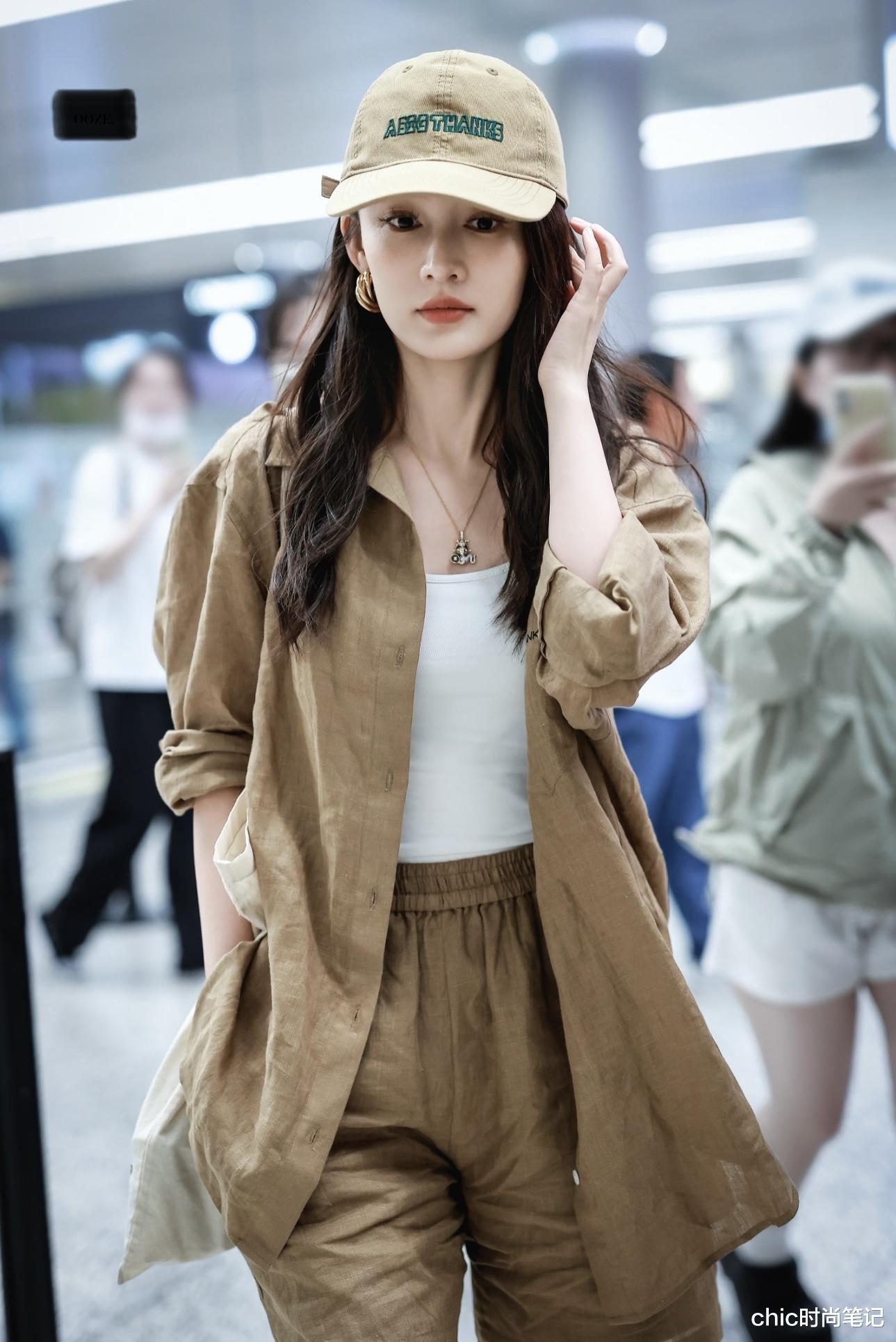 棕色亚麻衬衫套装搭配白色T恤,很简单也很舒服的一套穿搭,配上一顶同色系的鸭舌帽,不管是通勤还是旅行都很适配。