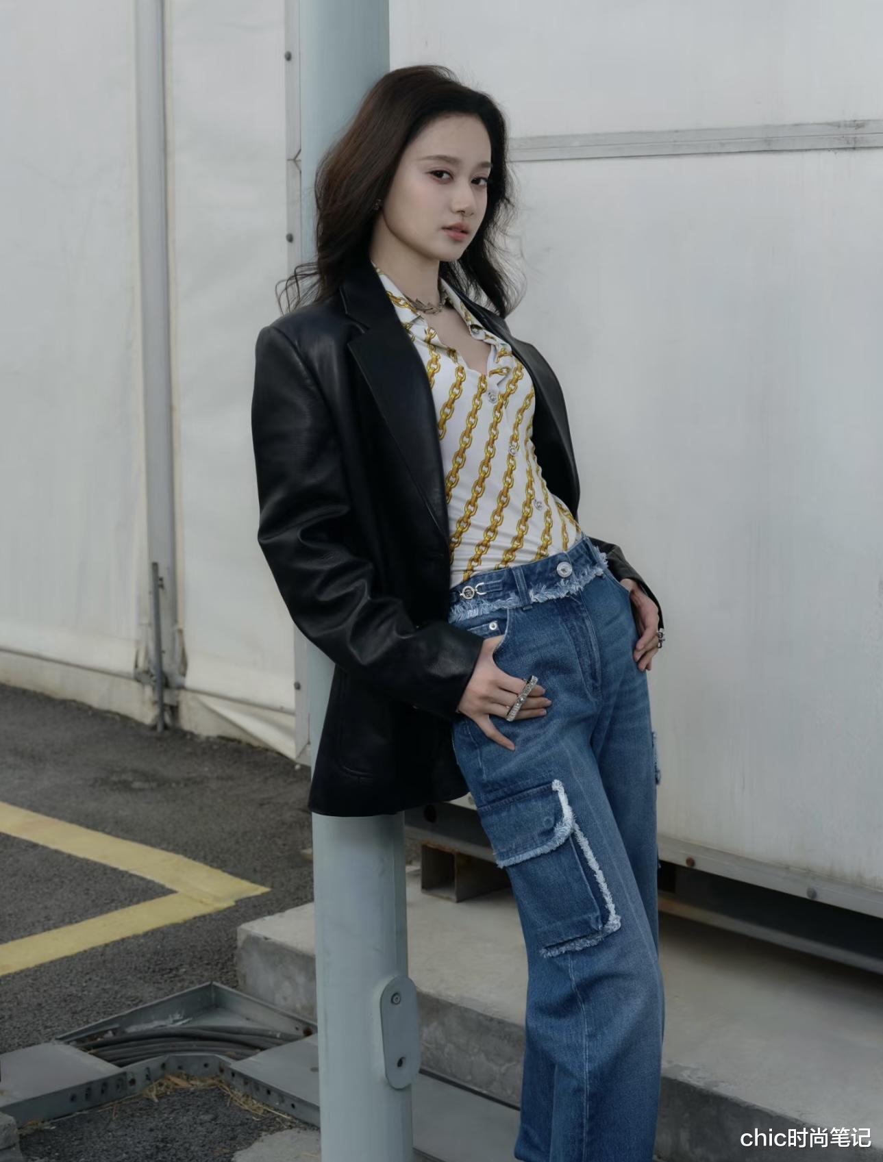 黑色皮衣自带酷飒姐感,内搭一件V领上衣,配上休闲牛仔裤,有一种90年代的港风女星的自信、张扬之美。