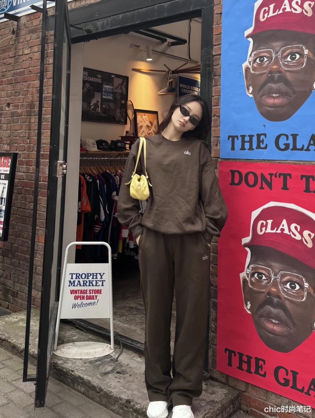 作为内娱的学霸美女夏梦,身穿深棕色卫衣套装搭配一个嫩黄色的包包,色彩的对比度做的非常好,吸睛又日常。