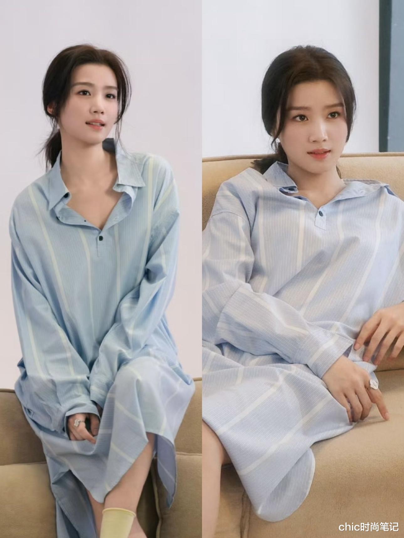 浅蓝色衬衫百褶连衣裙自带学院风,搭配小白鞋和小白袜妥妥的减龄穿搭,如果想穿搭更有层次感,那就学学李沁点缀一件黑白条纹针织衫,既可以作为外套保暖又可以起到时尚效果。