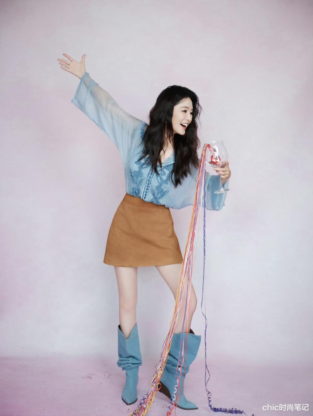 李沁的浅蓝色柔纱衬衫搭配姜黄色半身短裙,两个色彩对眼睛非常友好。日常出行搭配一个通勤包包,通勤look轻松驾驭!