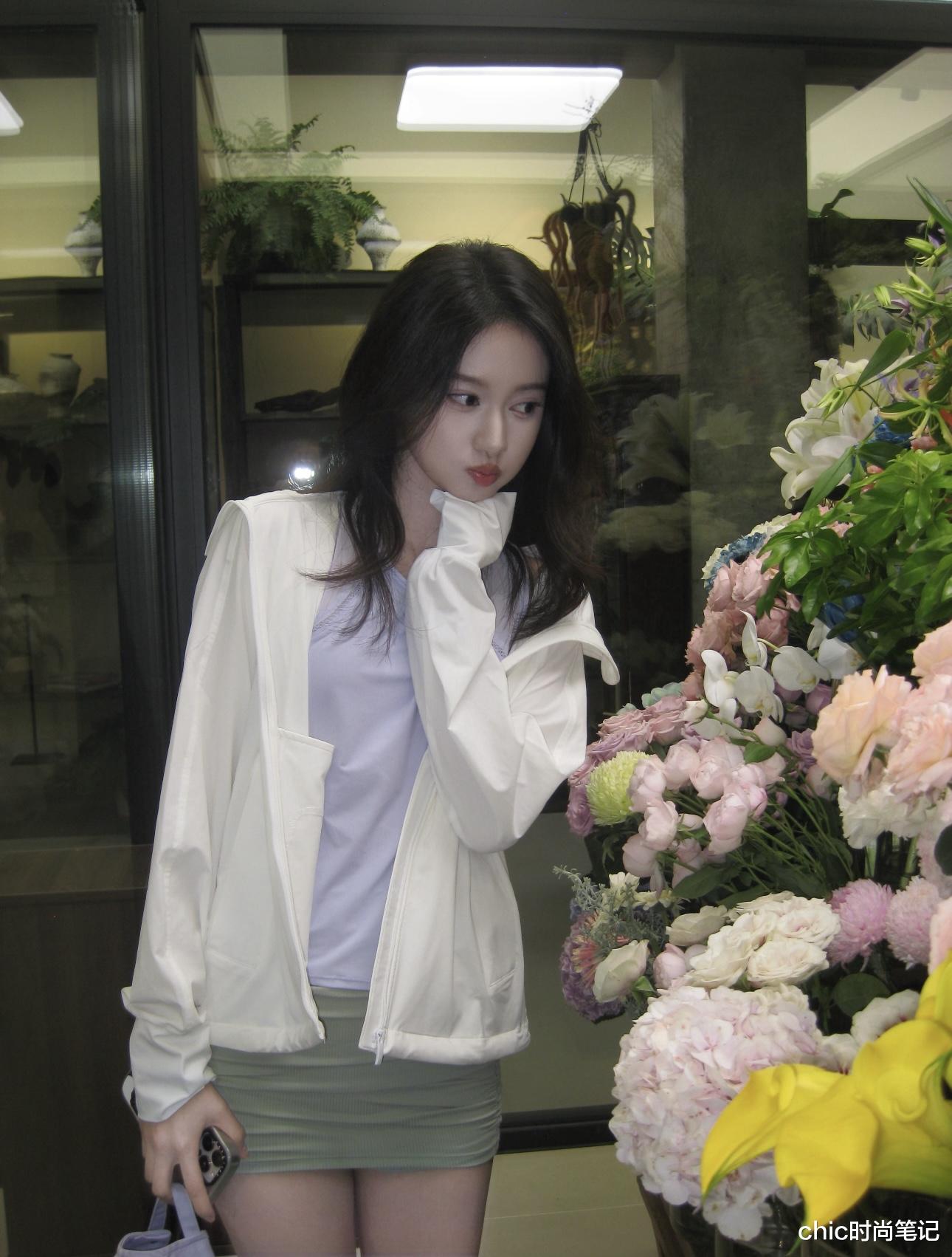 冲锋衣配短裙也是夏梦独一份的穿搭风格了,但每件单品的色彩都是低饱和度,所以三件单品碰撞在一起并不“乱”,反而有一种青春的美。