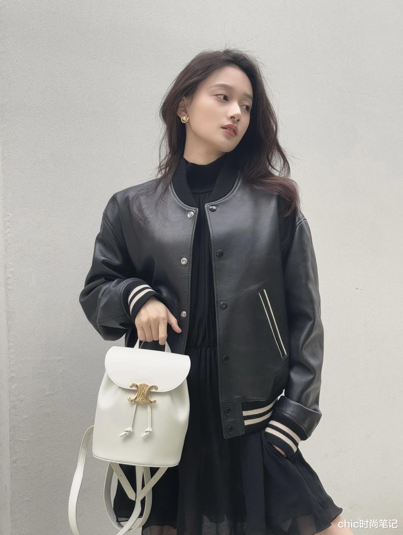 皮夹克搭配黑色纱裙,酷女生也有温柔的一面,配上白色双肩包,减龄又俏皮,但丝毫不减少气场。