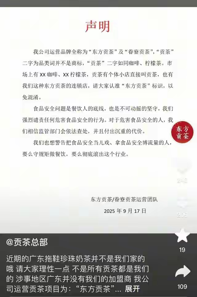 品牌方连夜发声明:我们不认识他!店主也慌了,赶紧解释自己就是个小店,名字带“贡茶”纯属描述品类,根本不是连锁。可解释没用,信任崩塌只在一瞬间。