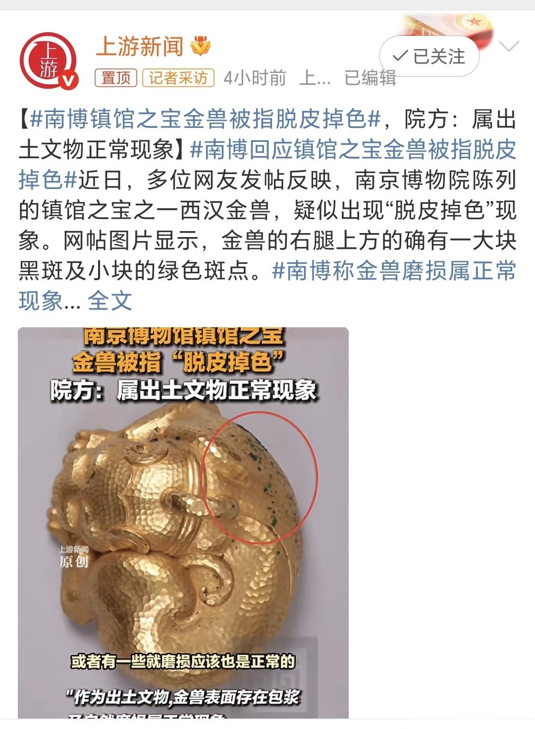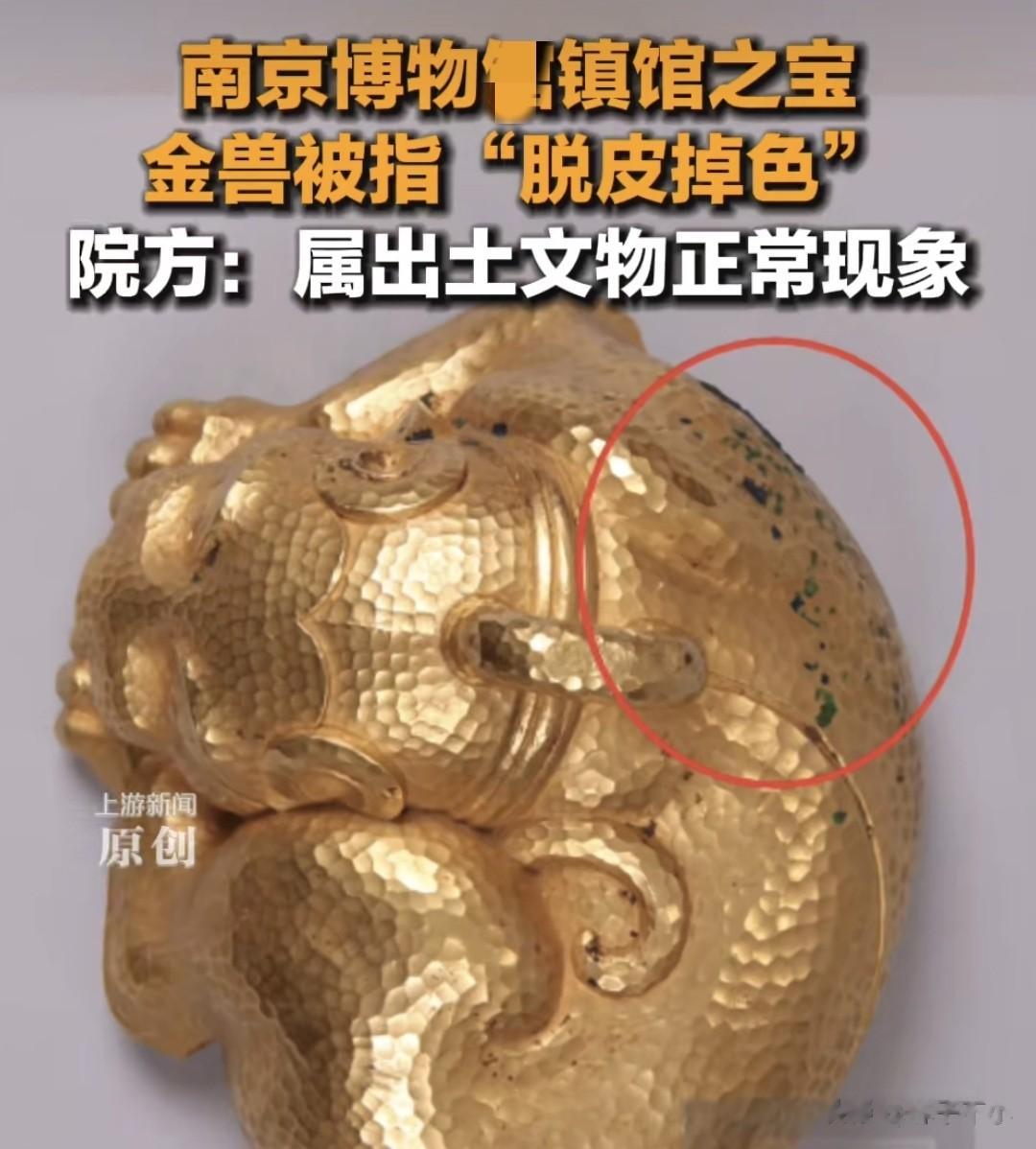 再陷风波2025年12月25日,据上游新闻报道,多位网友公开质疑,南博镇馆之宝之一西汉金兽,疑似出现了“脱皮掉色”的现象。
