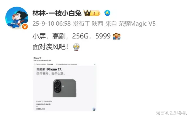 一线品牌中,就差华为和荣耀了。不过,爆料消息显示,两家也有望后续推出自己的小屏旗舰产品。荣耀高管 @林林-一枝小白兔 已经在微博上暗示,荣耀将有足以冲击iPhone17的小屏旗舰。