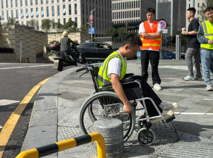 而在“无障碍斜坡通行”体验区,参与者们依次坐上轮椅,尝试独立通过人行道边缘的坡道。过程中,有参与者双手紧握轮圈,奋力向前推动轮椅,却因坡道角度略大,不仅上行艰难,还面临后滑的风险,这些细节让在场人员直观感受到,设施设计的优劣直接影响着残障人士的出行体验。