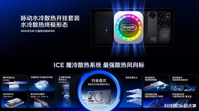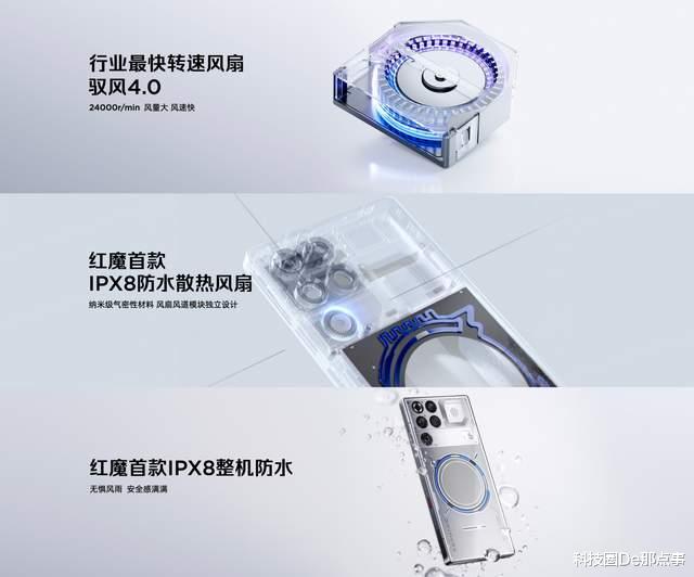 外观变化很大,仅限红魔11 Pro+加入了非常具有突破性的设计感,结合了创新散热设计——首创的“风水双冷”架构。水冷材料方面采用AI服务器同款氟化液,拥有-60℃至108℃超宽液态范围与绝缘不导电特性,解决低温结冰、高温汽化与漏液导电隐患;行业首创超低温键合工艺+0.85mm超薄陶瓷微泵与独家高分子缓冲材料,在机身内实现稳定水冷循环。将风扇升级至24000r/min 的驭风4.0 版本,不仅拥有高转速优势,能快速带走热量。同时全系整机IPX8级防水,有了具备防水特性与大风道设计结合,进一步提升了风冷效率与使用安全性。