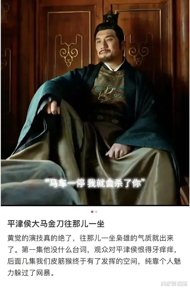 截至目前,剧情着墨最多,也最为出圈的,自然是黄觉塑造的平津侯。从一开场他就上线灭了蒯家18口人,狠辣到这个地步,但是网友们还是给他取了一个名字叫做皮筋猴。听起来似乎是爱意满满,非常受大家欢迎才能获得一个可爱的昵称。