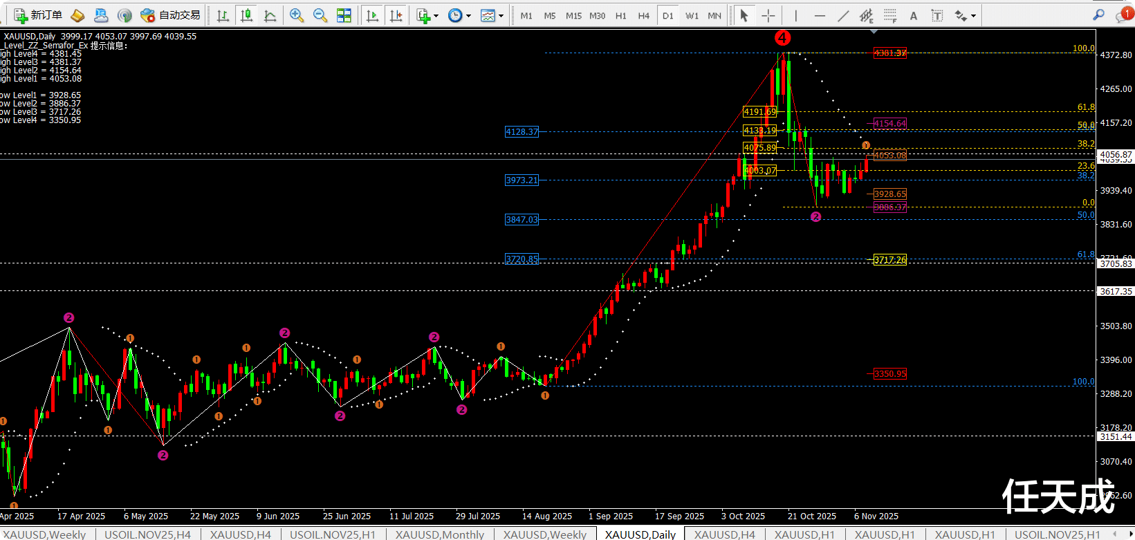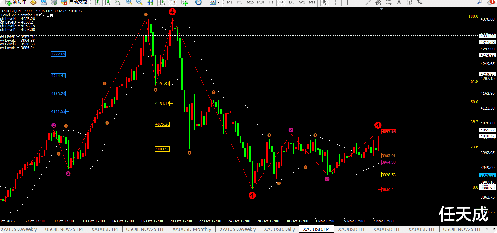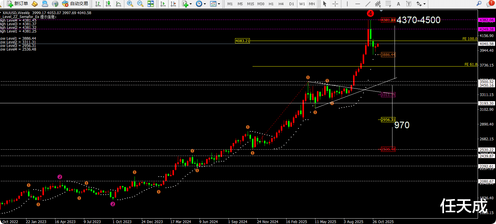 周线目前关注4082附近的压制,突破后会继续上涨。而下方关注支撑3940和3886一线,短期天成认为价格维持在3940--4082区间运行。