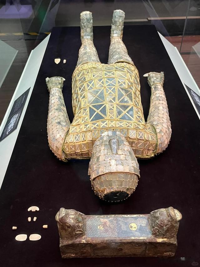 西汉时期文物,1968 年出土于河北省满城县刘胜墓,现藏于河北博物院 。中山靖王墓(也被称为满城汉墓)出土刘胜和窦绾的金缕玉衣是我国考古发掘中首次发现的、保存最为完整的汉代玉衣。 刘胜金缕玉衣,长1.88米,用2498片的玉片和约1100克的金丝制作而成。整件玉衣按照人体结构比例制作,可以分为头部、上衣、裤筒、手套和鞋等部分,每一部分都可以彼此分离,犹如制衣工人裁剪缝制的一件衣服。外观与男子体形一致。玉片大小形状各异,经过精心设计、切割、打磨、钻孔后编缀成型。作为封建贵族特制葬服,它的出土证实了史书中 “金缕玉衣” 的记载,对研究西汉葬制及玉石金工工艺意义重大 。