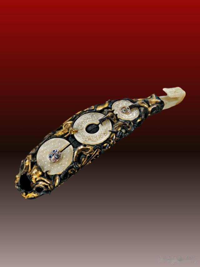 1951年河南辉县固围村出土,长18.7、宽4.9厘米,中国国家博物馆收藏。此件带钩由白银制成,器形较大,通体鎏金,钩身铸浮雕式的兽首和长尾鸟,兽首分列钩前后两端,长尾鸟居钩左右两侧,盘曲逶迤。钩身正面嵌饰白玉玦3枚,玉玦中心各镶一粒半球形琉璃珠,钩身前端镶白玉琢成的雁首形钩首,从侧面看犹如一只曲颈高歌的鸿雁。带钩的制造工艺也十分精湛,采用鎏金、镶嵌、凿刻等多种方法,将不同质地、不同色泽的材料,巧妙地配合使用,使不同色彩的对比非常和谐,产生绚丽多彩的装饰效果。此带钩纹饰繁复,玲珑剔透,包金镶玉,雍容华贵,是战围带钩中的精品,极为奢华,反映了当时金银工艺的最高水平。