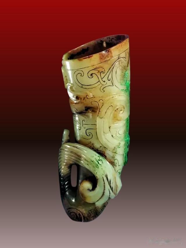 西汉时期文物,1983 年出土于广东省广州市西汉南越王墓,现藏于西汉南越王博物馆。这个玉杯被雕刻成犀牛角的形状,是因为汉代认为犀牛角酒杯可以溶解毒物。杯身雕刻一尖嘴夔龙,龙头为浅浮雕,龙身逐渐凸起为高浮雕,杯底为圆雕,多种雕刻技法集于一身,堪称汉玉之绝品,代表了当时高超的玉雕技艺,反映了南越国独特的文化风貌 。
