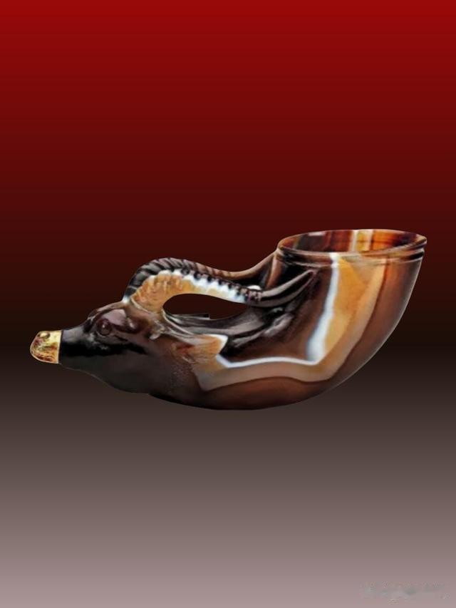 镶金兽首玛瑙杯是唐代玉器。是国宝级文物,国之重宝。文物尺寸:高6.5厘米,长15.6厘米,口径5.9厘米。