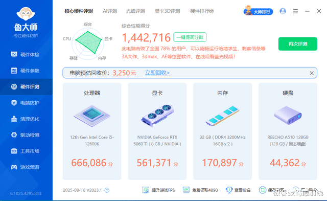 鲁大师跑分,总得分是1442716分,其中显卡部分是561371分,表现优异。