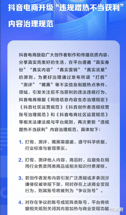 近日,抖音电商升级“违规蹭热不当获利”内容治理规则,明确对以“打假”“测评”“揭黑”为名、实则引流带货的行为进行限制。新规直指部分创作者借热点事件制造争议、博取流量,并在相同或关联品类中开展商业变现的灰色操作。消息一出,引发行业广泛关注。