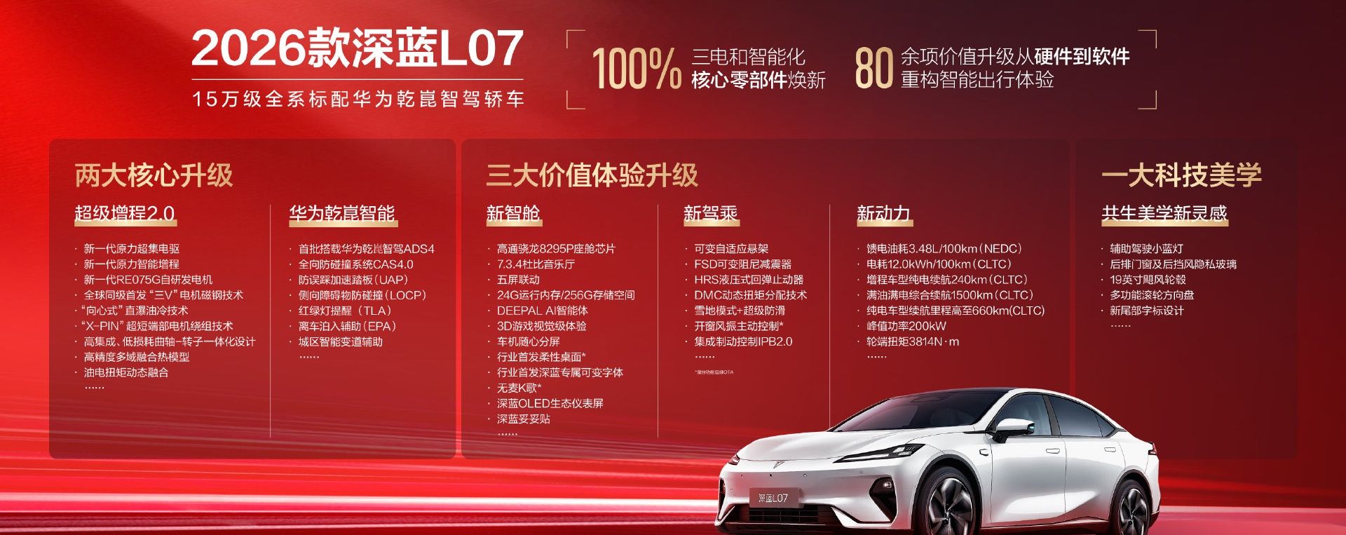 官方表示,2026款深蓝L07的三电和智能化核心零部件进行了100%焕新,整车从硬件到软件实现多达80余项价值升级,进一步重构智能出行体验。