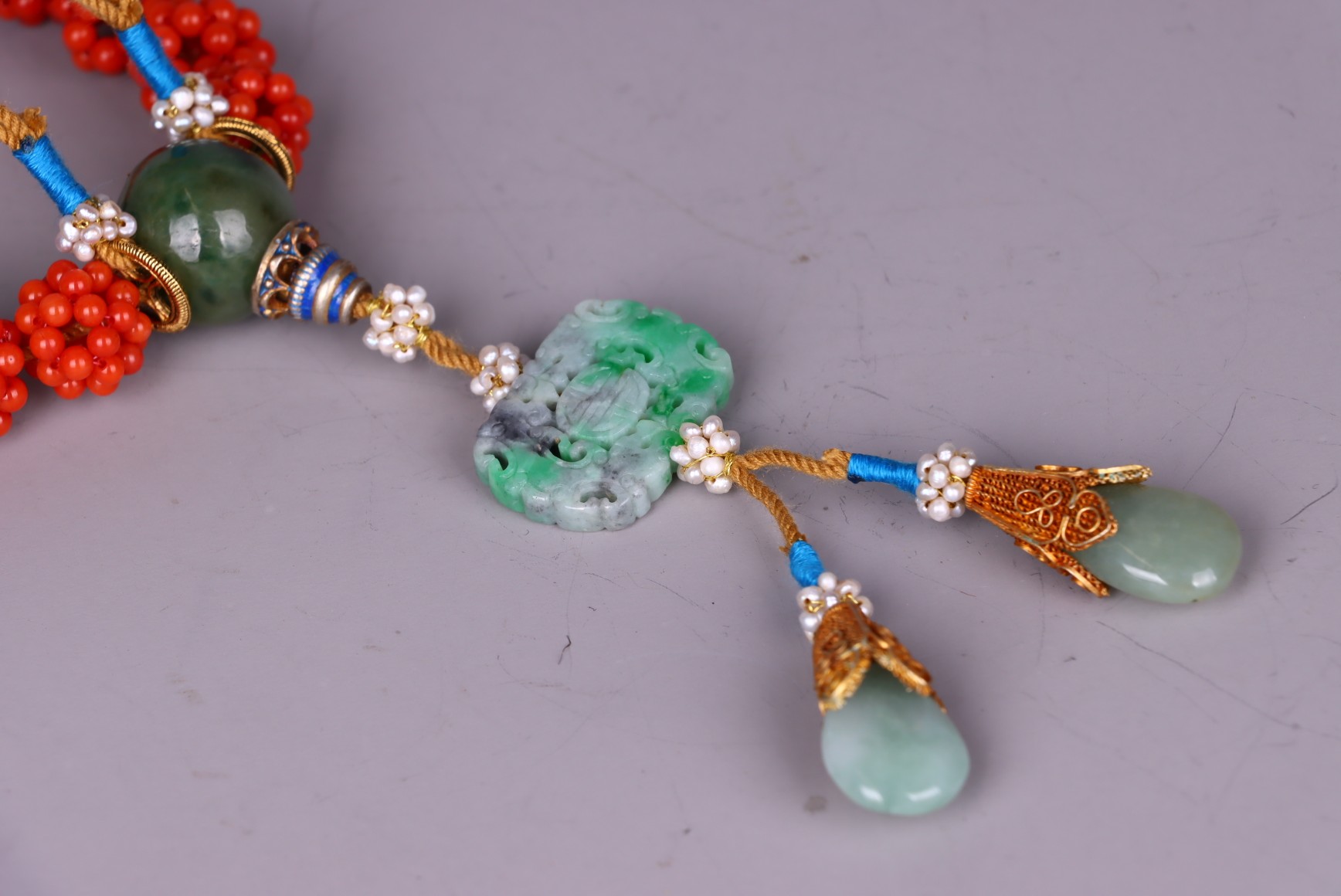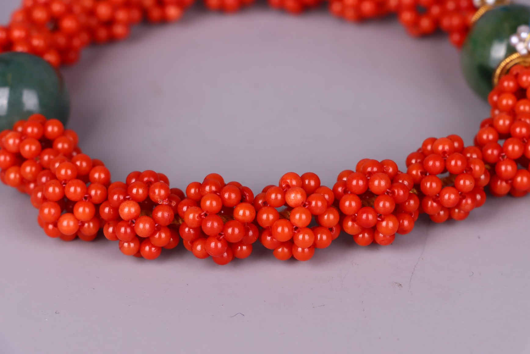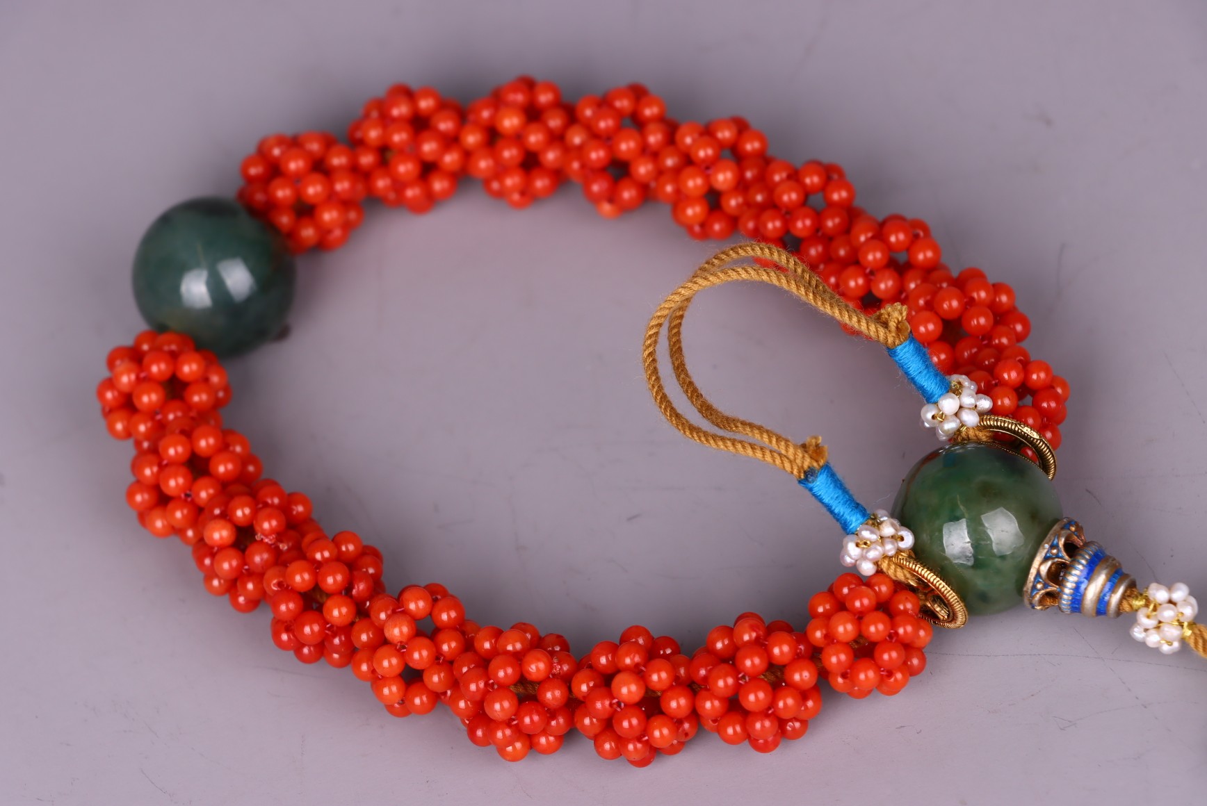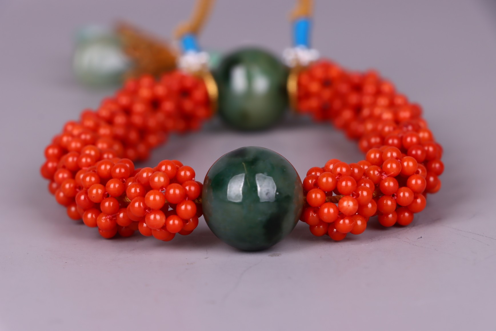 回流:【辑米珠十八子手持】 规格:珠径1.2㎝隔珠径1.4㎝重61g 简介:藏品取材上佳,红衫瑚辑米珠饰,色泽艳丽,粒粒精选,搭配天然翡翠隔珠、翡翠刻吉祥结背云,水滴珠饰,做工精致,包浆醇厚,收藏佳品。全品!