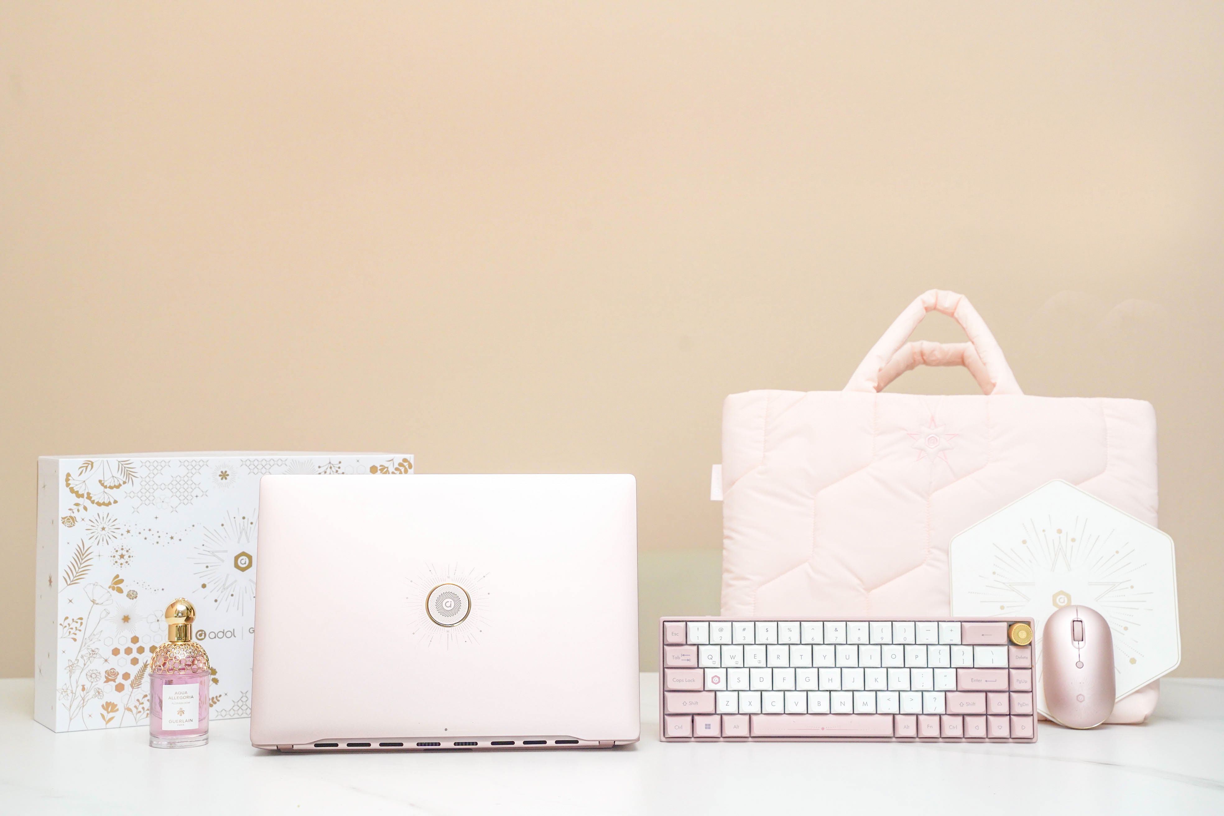 华硕a豆14 Air 香氛版包含娇兰定制的闪光礼盒,除了限定华硕a豆14 Air 香氛版以外,还附送定制云朵电脑包、定制无线鼠标、定制星芒鼠标垫、娇兰奇迹花园75ml淡香水及三款定制香氛片,这样粉嫩的一套小姐姐应该没有抵抗力。