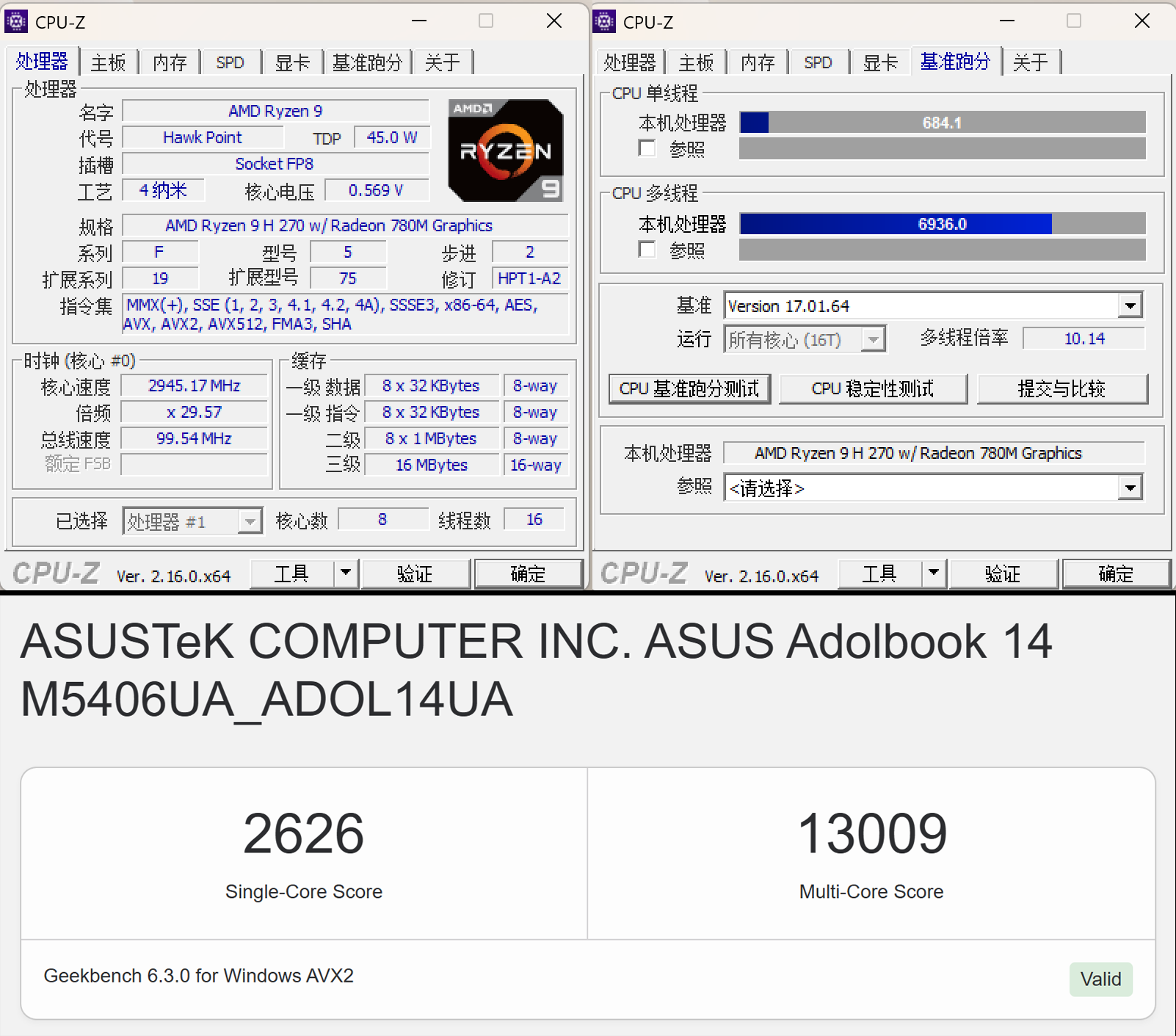 华硕a豆14 Air 香氛版搭载AMD锐龙9 H 270 AI处理器,采用4nm制程工艺,Zen 4架构、8核心16线程、最高频率5.2GHz,配备了16MB的L3缓存,TDP 45W,如果开启全速散热模式CPU性能释放可以达到50W。这颗CPU属于当下中高端处理器,性能强劲的同时兼备较低的功耗,再加上39 TOPS AI算力,让多任务处理与AI创作如虎添翼。使用CPU-Z 2.16版本测试CPU单线程得分684.1分,多线程得分6936分。Geekbench 6测试单核性能2626分,多核性能13009分。