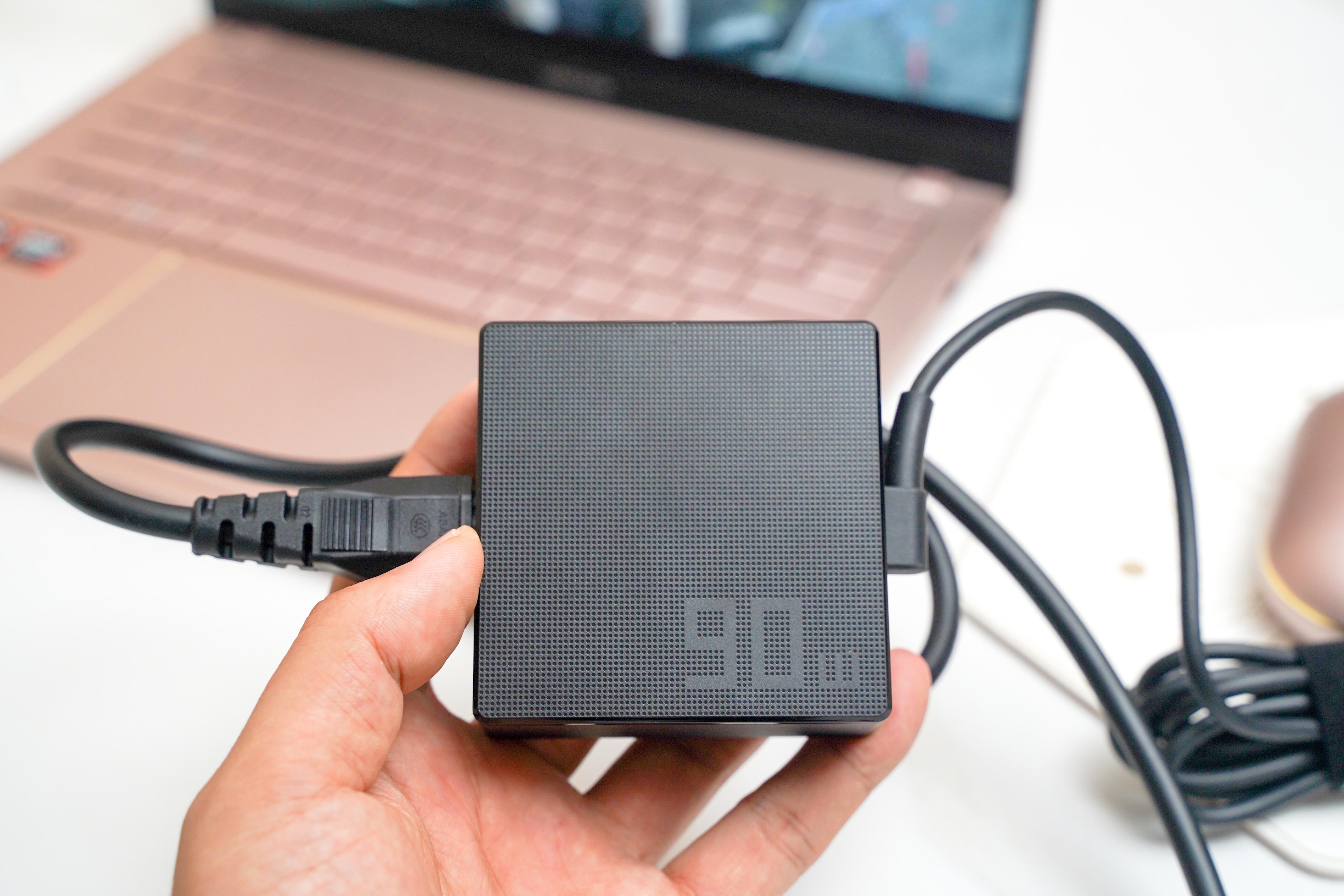 华硕a豆14 Air 香氛版附送的是一个小巧的90W Type-C电源适配器,半小时可以为电脑提供50%左右电池电量,这个充电速度已经很强,而且笔记本还支持100W PD快充,充电速度能更快一些。